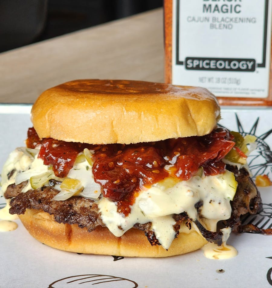 Gotham Smash Double, provolone melt, Black Magic jammy tomatoes, Creole remoulade, and spicy onion chow chow so clean it should come with a brass band. NOLA in burger form.